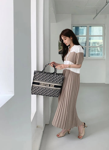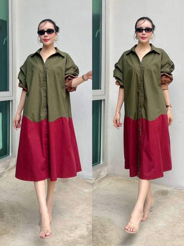 Description: A chic button-down midi dress featuring a unique two-tone design. The front is crafted...