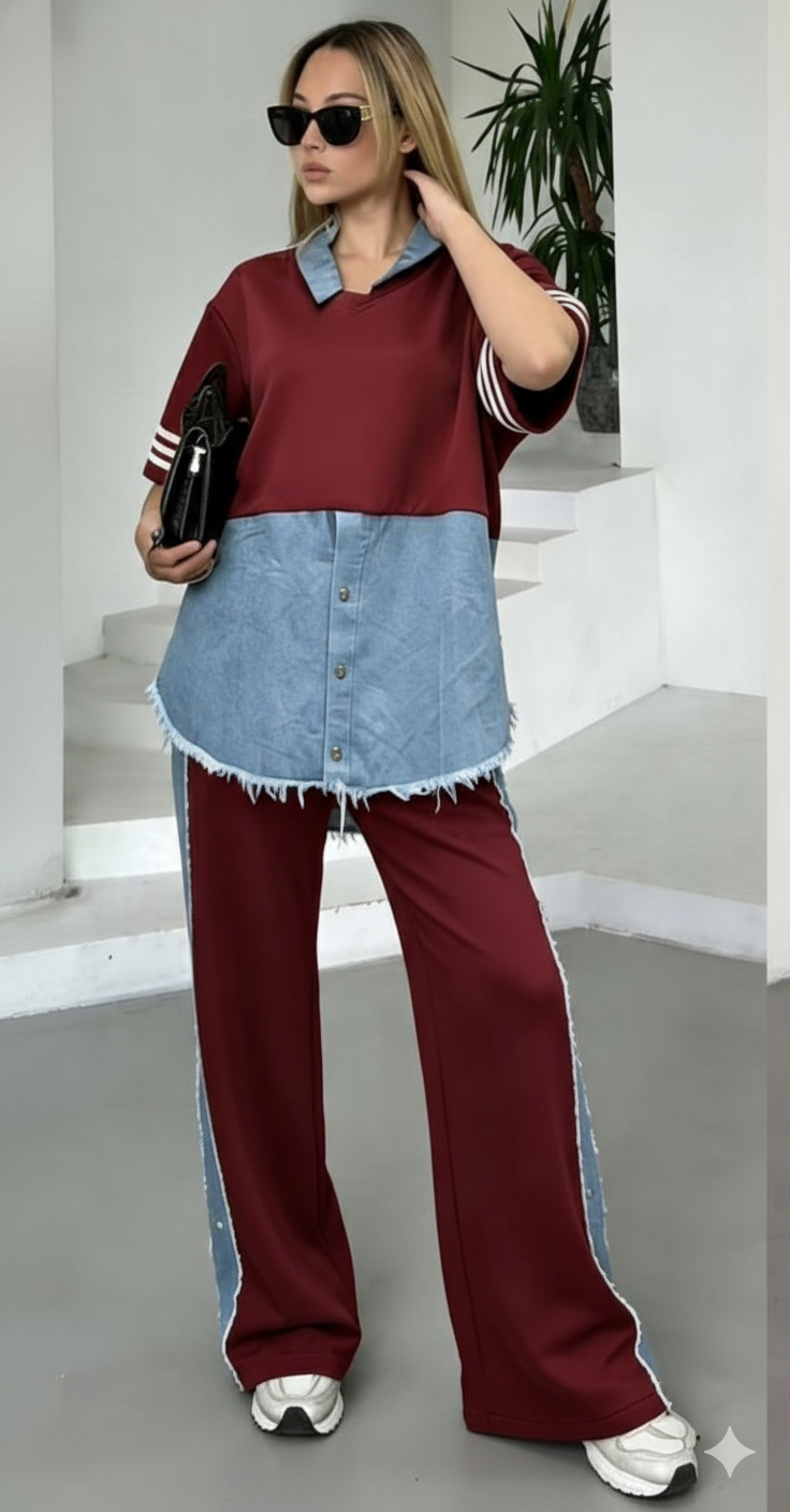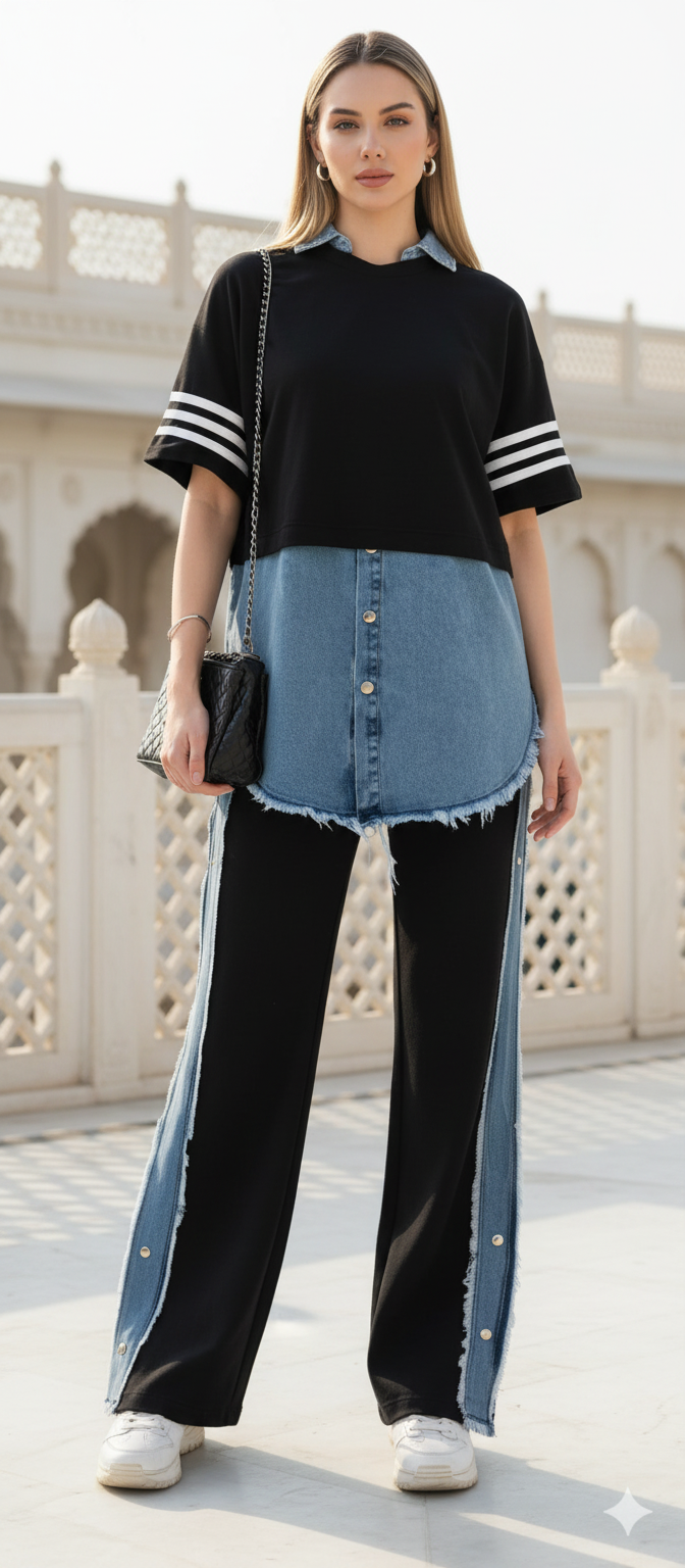 Soft, sporty and statement-making — this blush pink and denim color-block co-ord brings effortless street style to your everyday wardrobe. Featuring a relaxed polo top with denim panel detailing and wide-leg pants with contrast stripes, it’s the perfect mix of comfort and cool. Ideal for brunches, travel days, or casual outings.