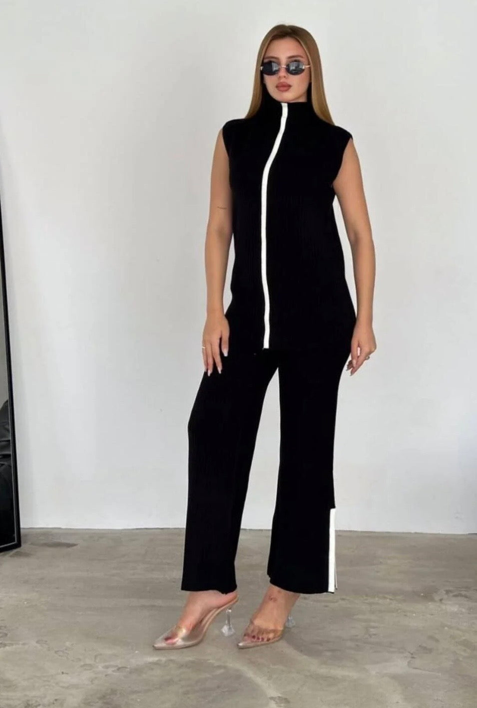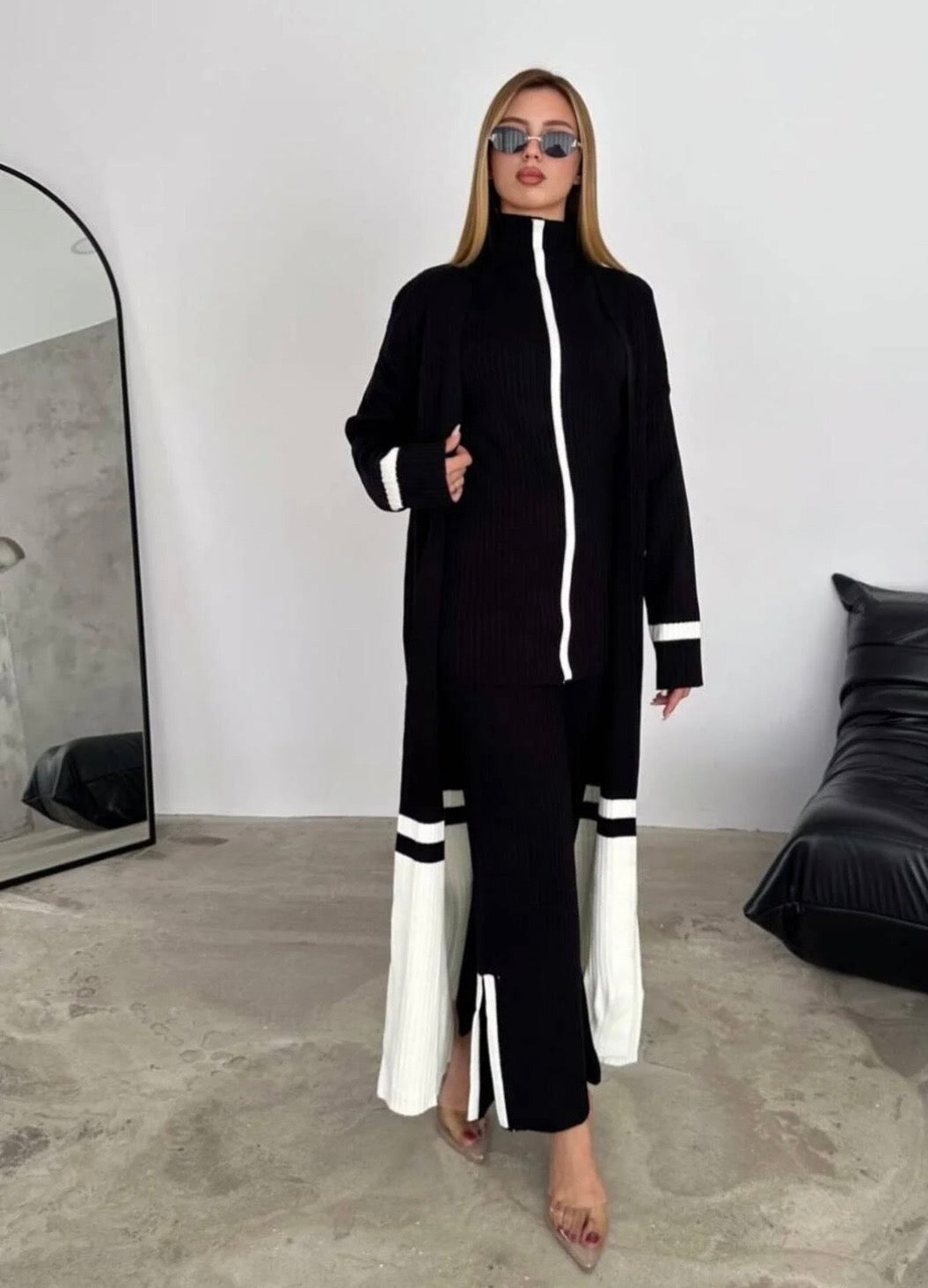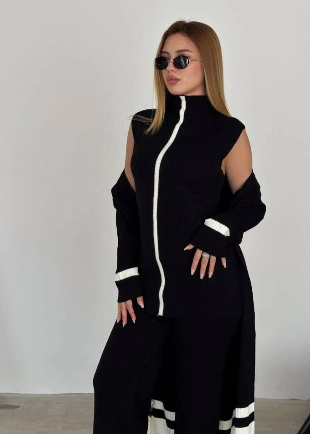 A sleek monochrome statement co-ord set designed for effortless winter elegance. Featuring a high-neck, front-open longline top with contrast white detailing, paired with straight-fit pants accented with ribbed panels for added movement and style. The structured yet flowy silhouette makes it perfect for elevated daywear, travel looks, or chic evening outings. Minimal, modern, and undeniably powerful.