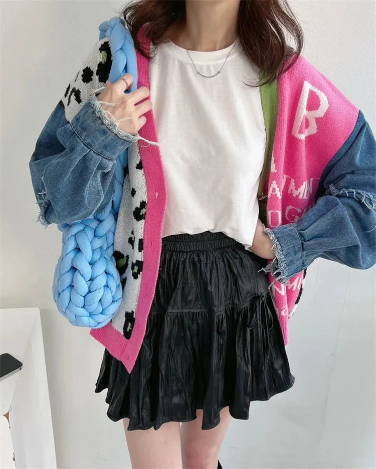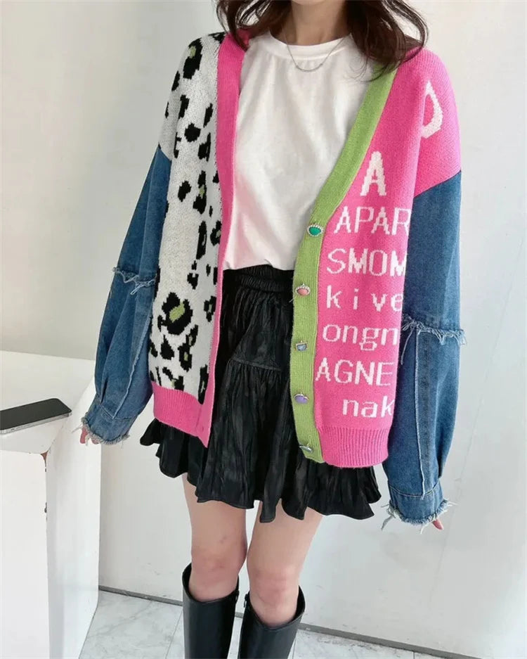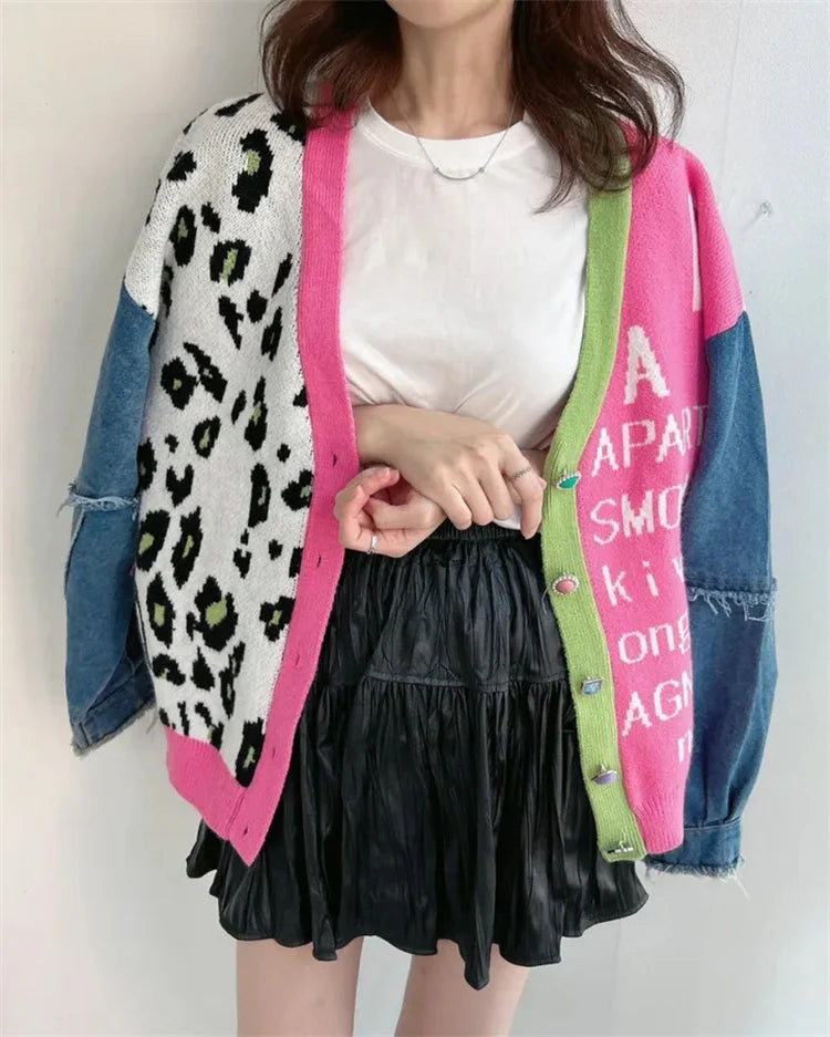A bold statement cardigan that blends playful prints with street-style edge. Featuring a striking mix of leopard pattern, contrast text detailing, and denim sleeves, this cardigan adds instant attitude to any winter look. Designed with a button-down front and a relaxed fit, it’s perfect for layering over basics while keeping your style effortlessly chic. Ideal for casual outings, travel days, or fashion-forward winter styling.