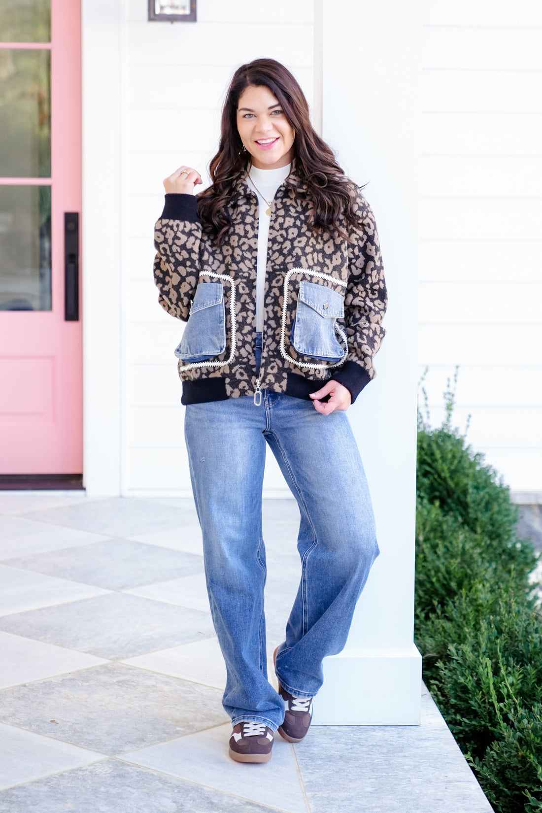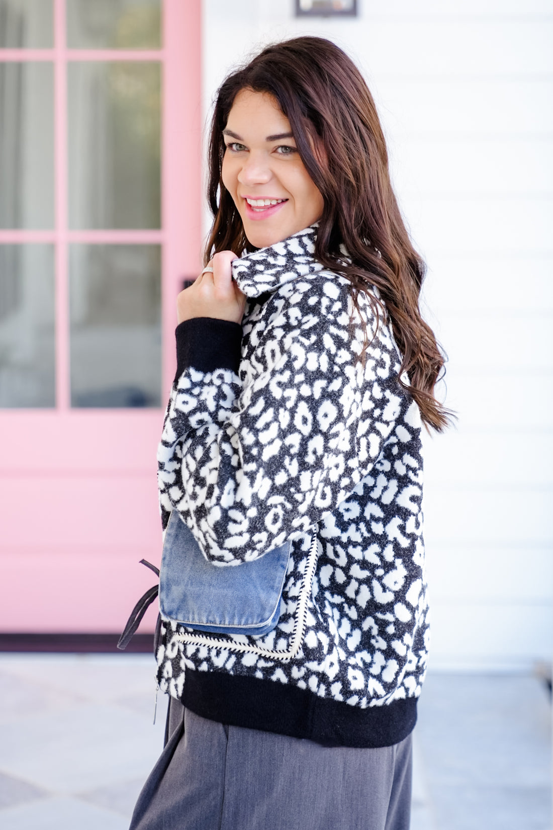 The jacket is where wild meets chic. This standout layer combines the fun of animal print with the laid-back cool of denim accents. The oversized silhouette and statement pockets make it a conversation starter. Perfect for pairing with faux leather leggings, denim, or joggers when you want to keep things comfy but fashion-forward.