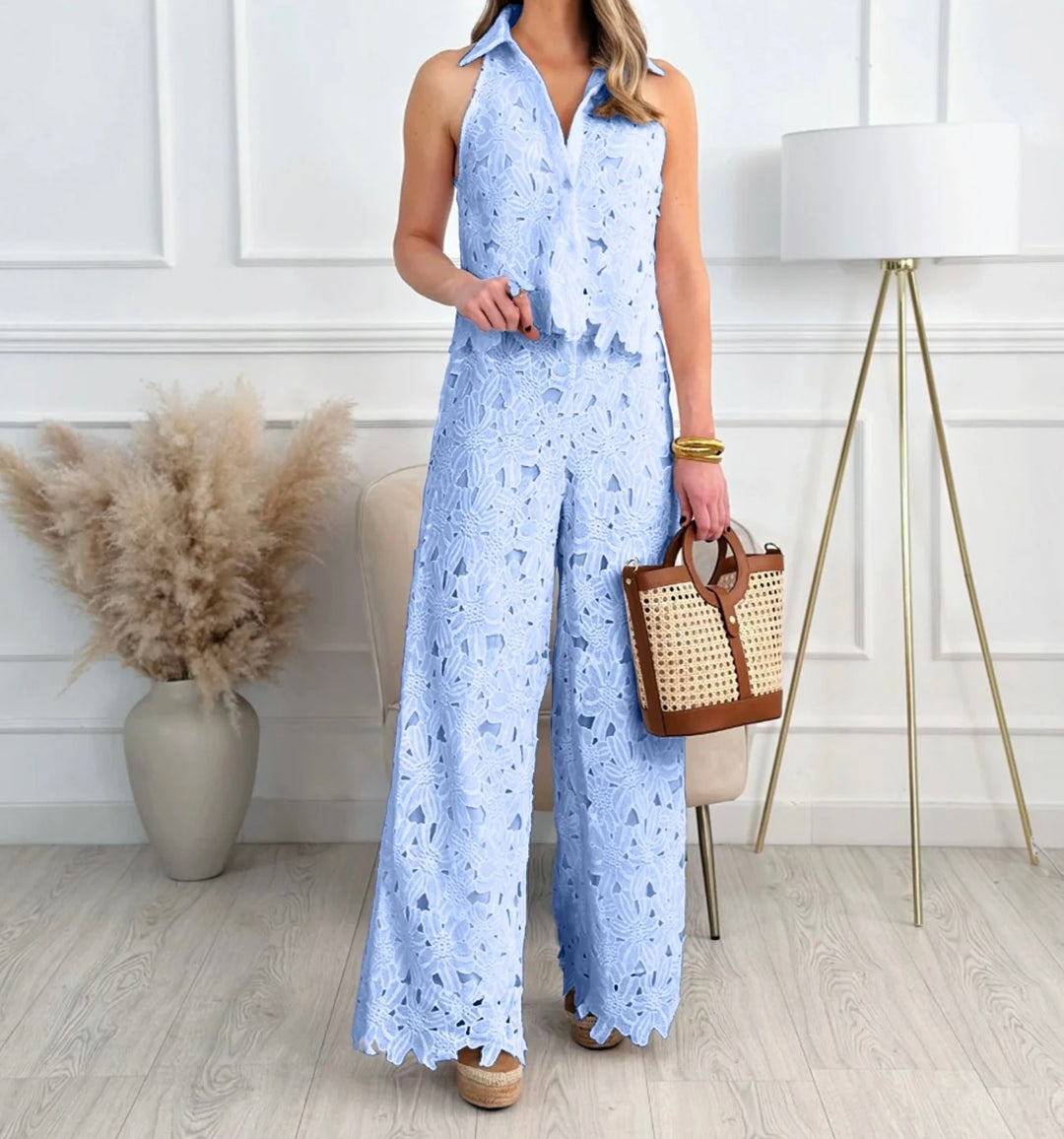 Step into effortless elegance with this blush pink lace co-ord set designed to make a statement. Featuring a sleeveless collared top with intricate floral lace detailing paired with wide-leg lace trousers, this outfit perfectly blends sophistication with modern style. The delicate cutwork pattern adds texture and femininity, while the relaxed silhouette ensures comfort throughout the day. Ideal for brunches, vacations, summer gatherings, or chic daytime events.