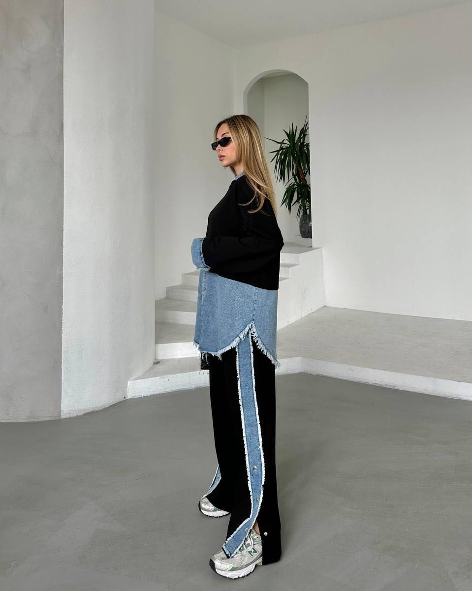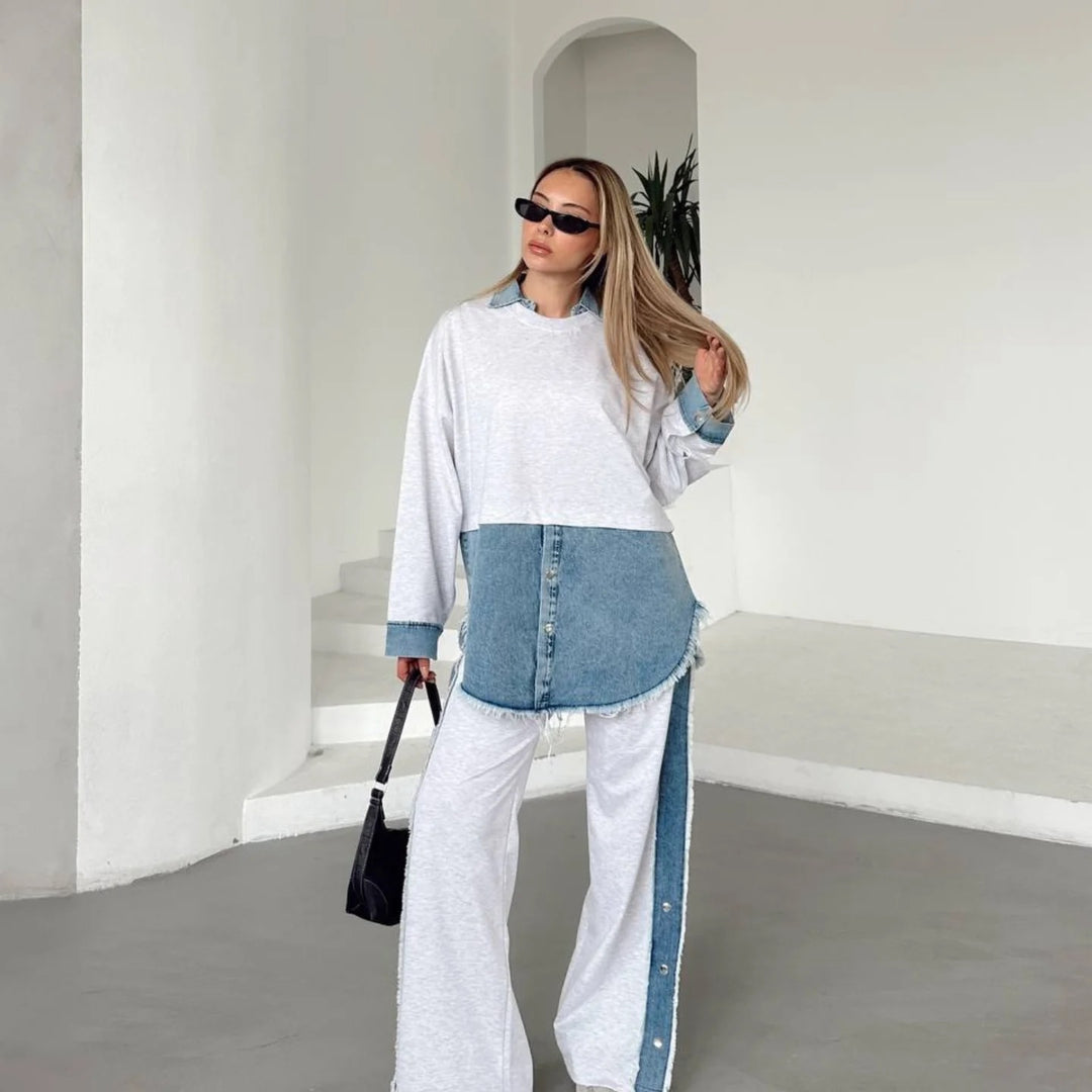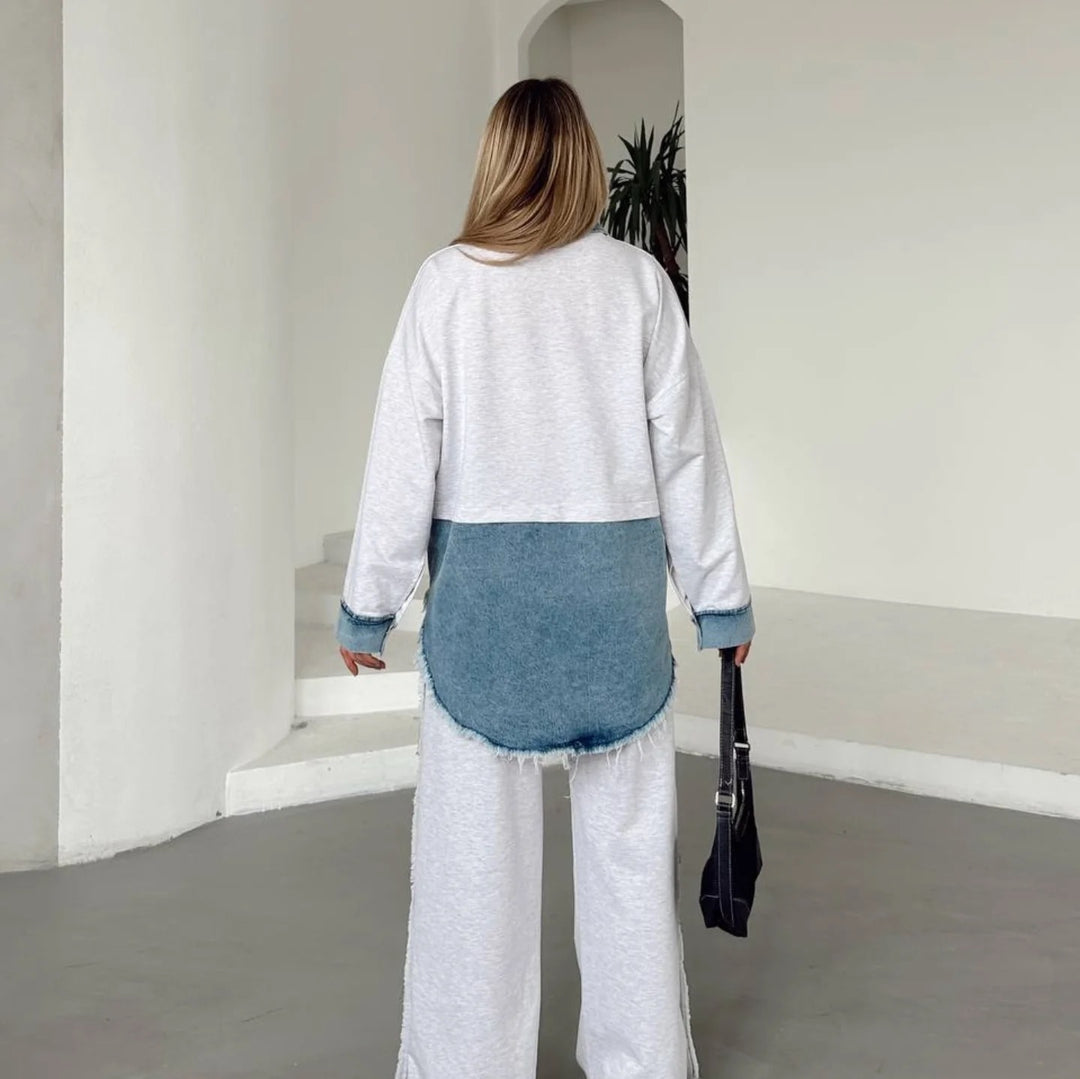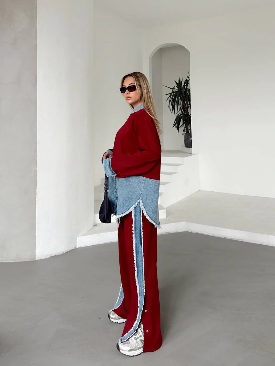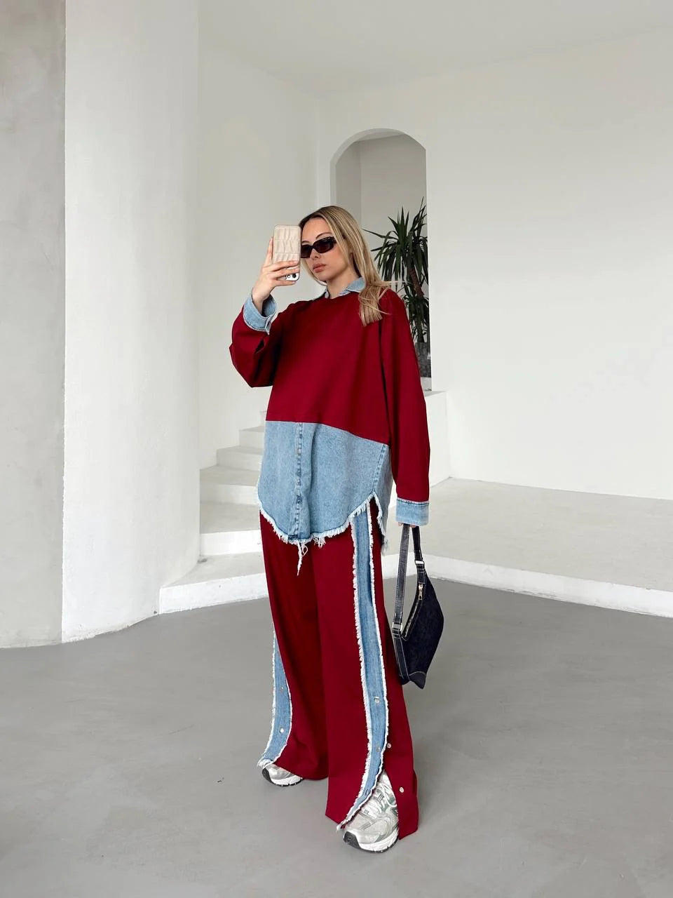 Our coordinated fall set featuring a coordinated Blouse with denim detailing and a coordinated wide legged denim panel pants is for sure a show-stopper. Summer sets are all year round clock best sellers. From a day occasion, tonight's get-together the minimalistic design detailing makes it a perfect set for all your vacation fits