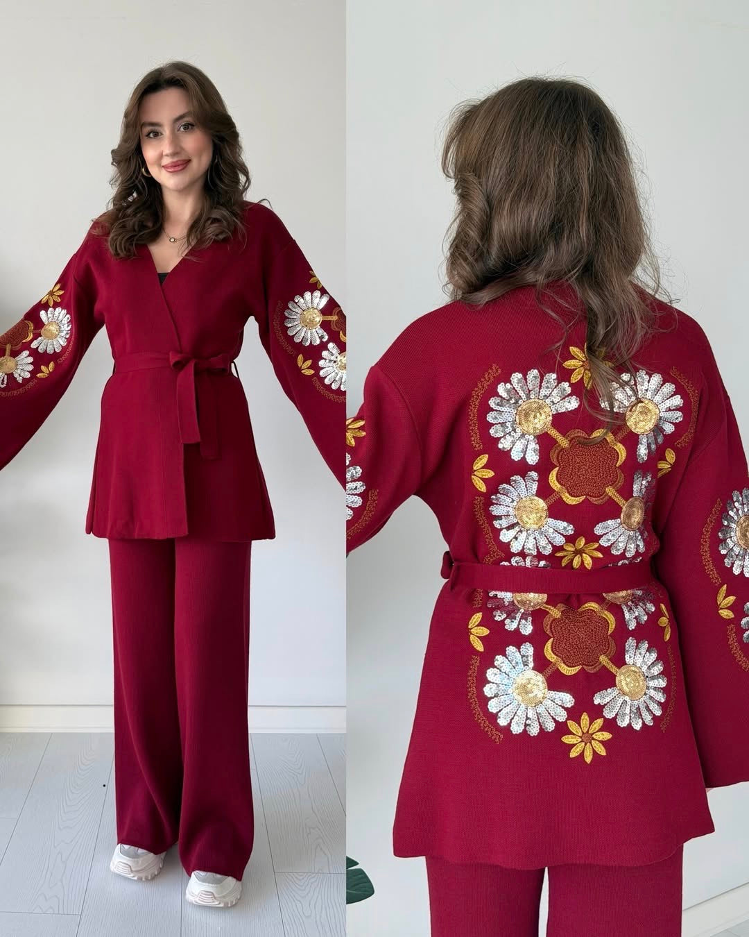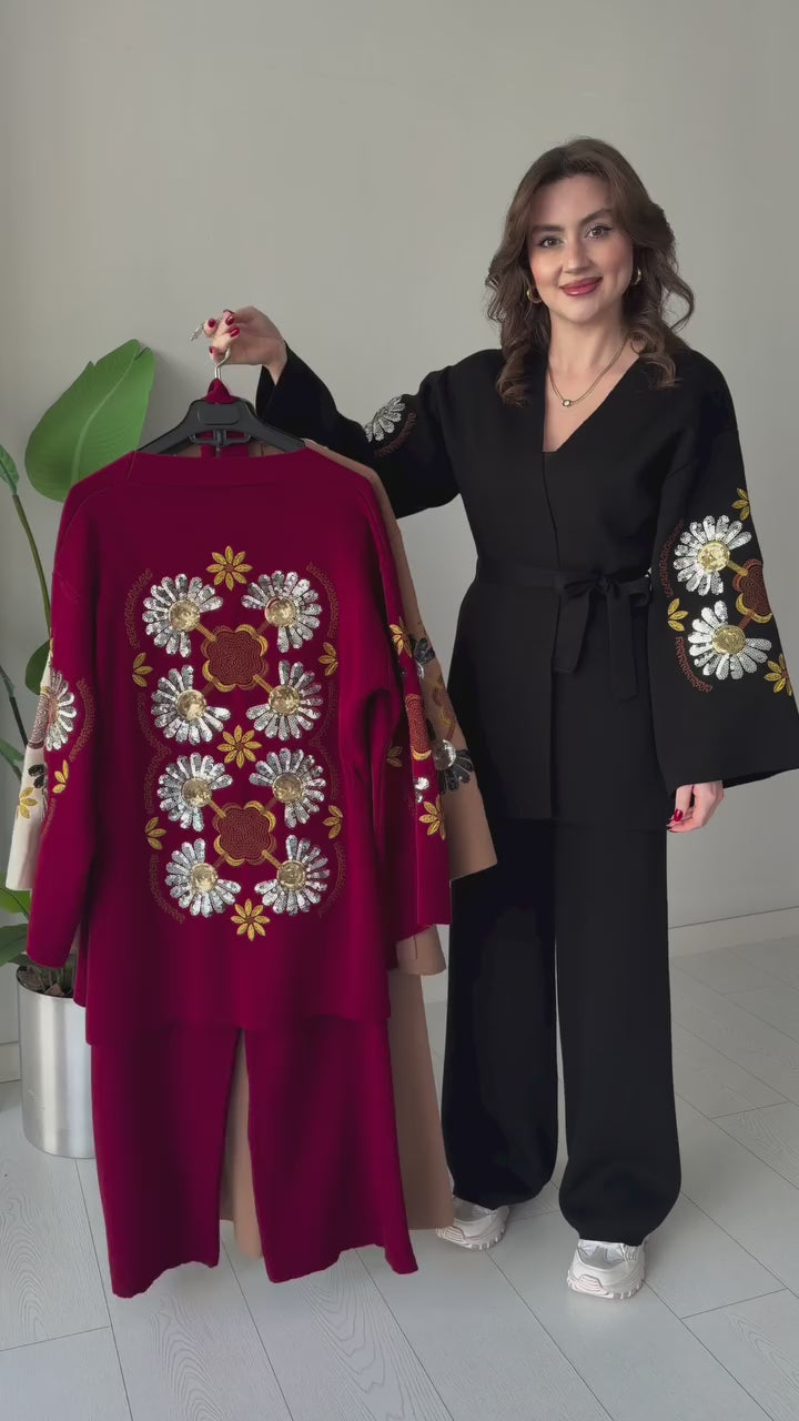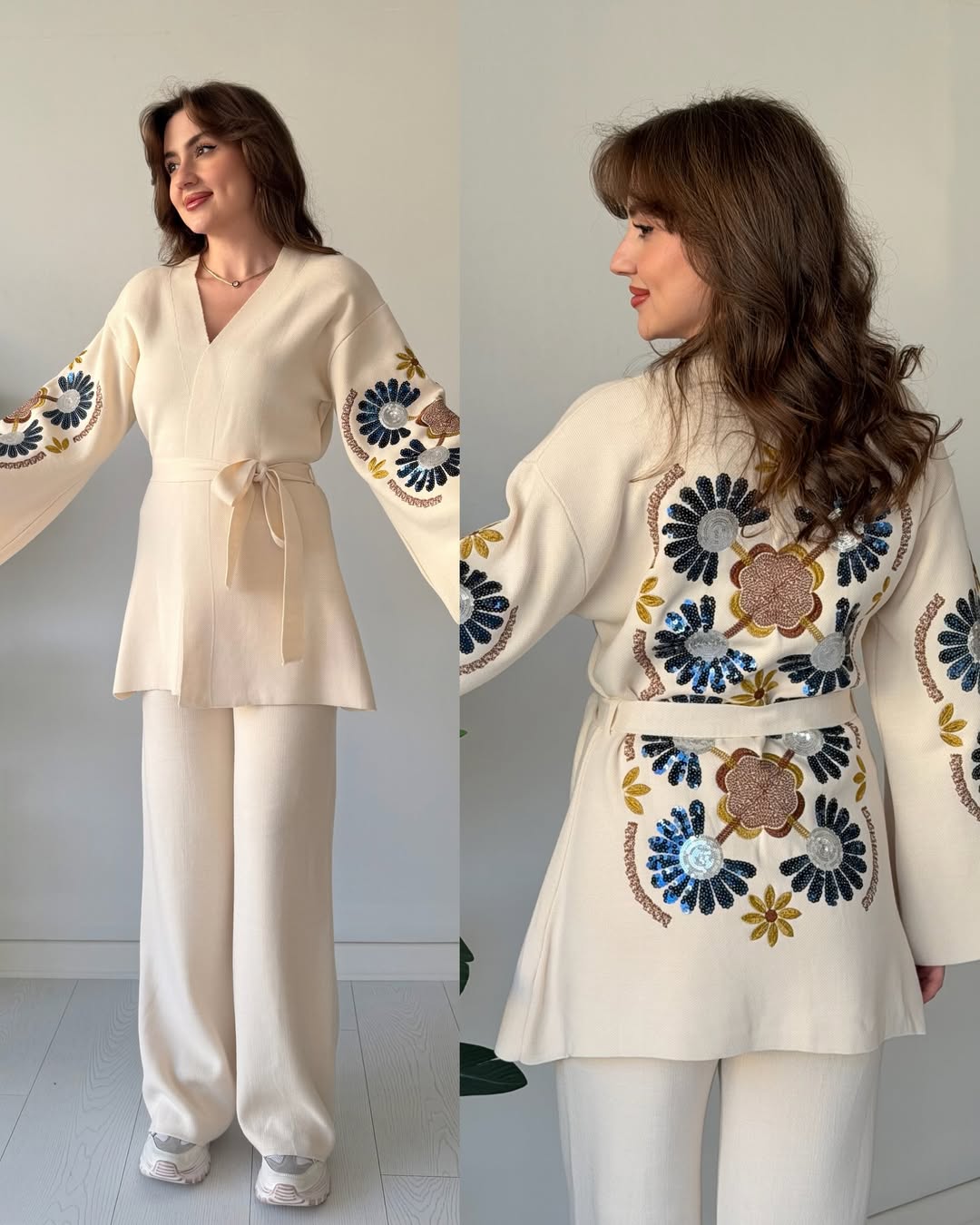 A statement co-ord set featuring a wrap-style embroidered jacket paired with relaxed straight-fit pants. Intricately embellished floral motifs on the sleeves and back add an artisanal touch, while the tie-up waist creates a flattering silhouette. Designed to move effortlessly from day elegance to evening sophistication.