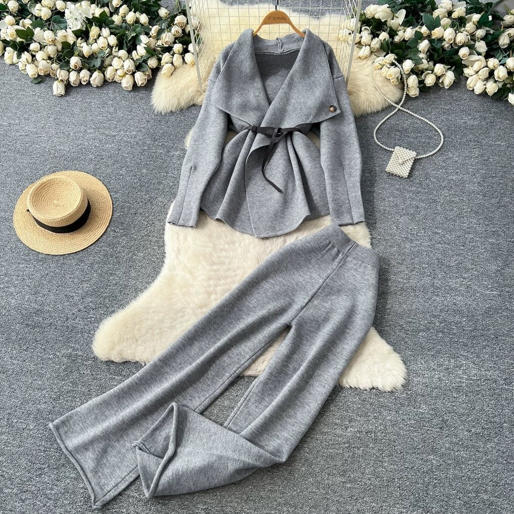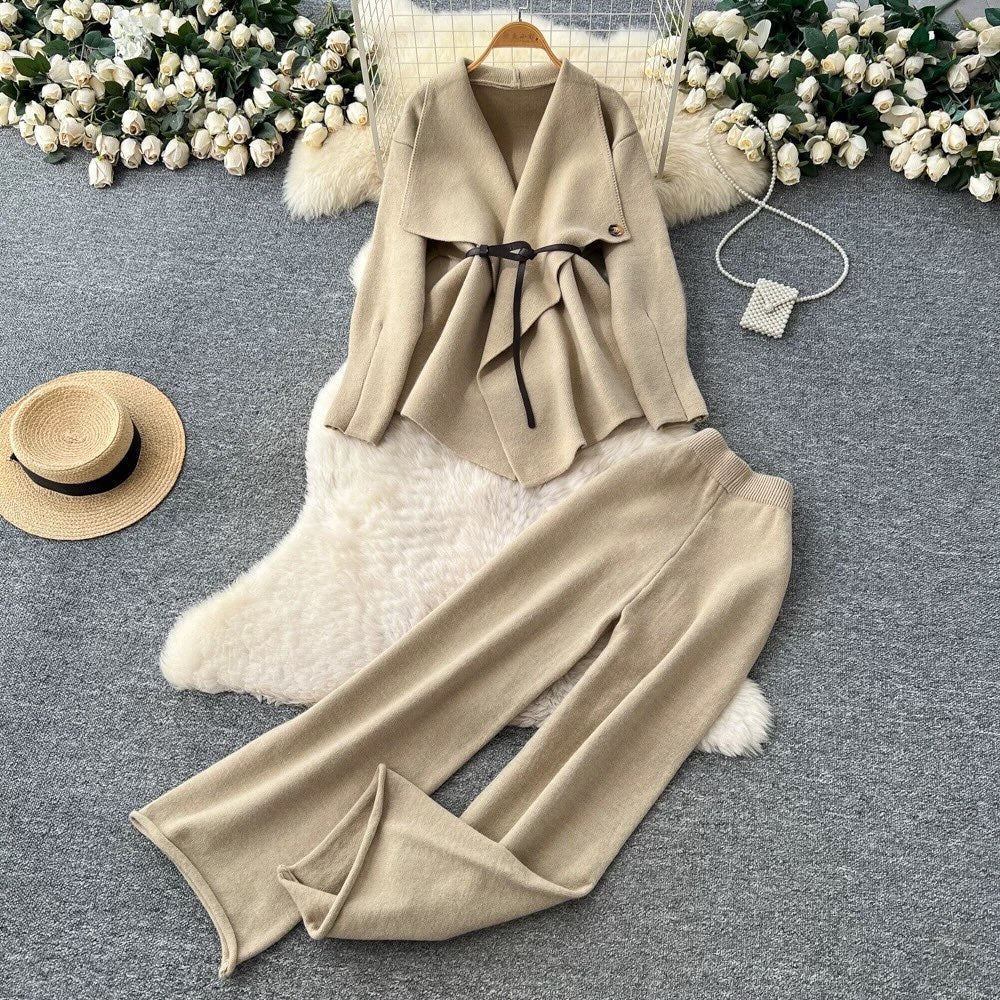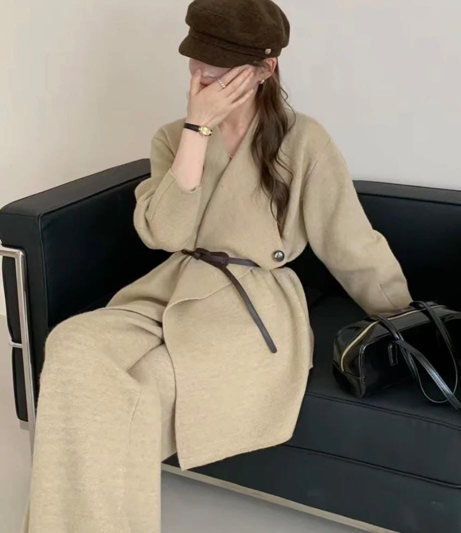 An elegant winter co-ord set designed for effortless sophistication and comfort. Featuring a wrap-style knit top with a flattering tie-up waist and relaxed straight-fit pants, this set offers a polished yet cozy look. The soft drape and structured silhouette make it perfect for winter outings, travel days, or elevated casual wear. Style it with boots or heels for a refined cold-weather ensemble.
