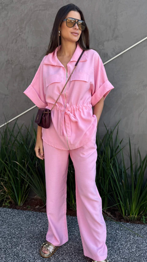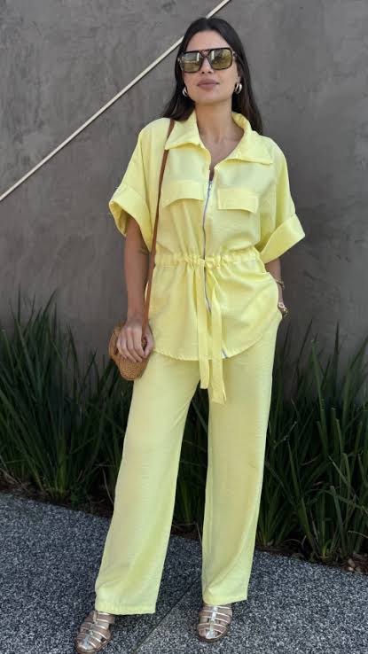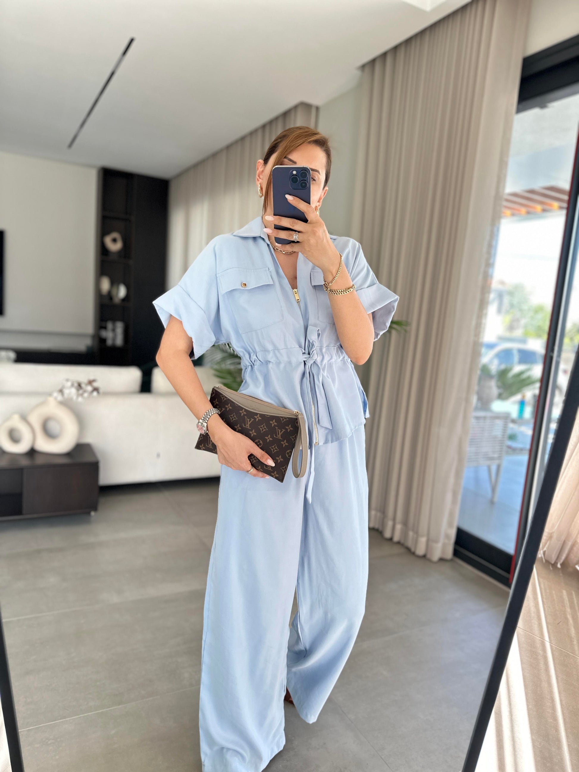 This powder blue co-ord features a relaxed zip-front shirt with a flattering waist tie and flowy wide-leg pants for all-day comfort with a polished look.