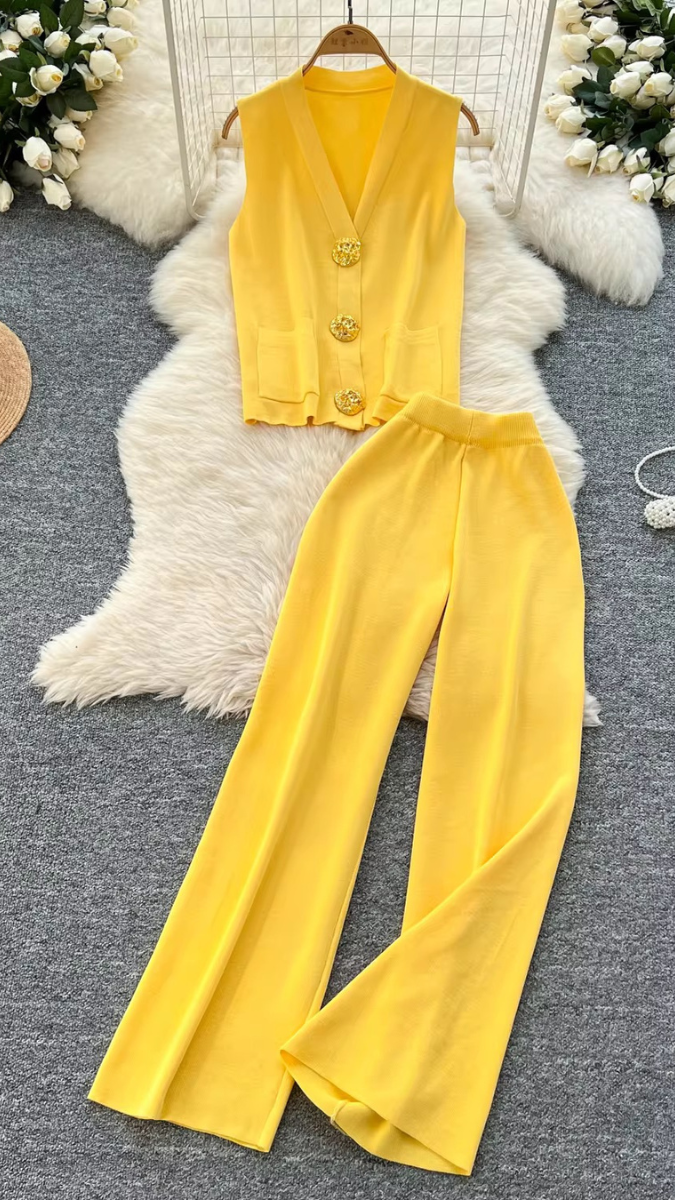 Say hello to sunshine in our vibrant yellow co‑ord set, crafted in a breathable summer knit. The sleeveless top features eye-catching gold floral buttons and roomy front pockets, while the relaxed-fit pants offer easy movement and style. Whether you’re heading to a day event or a casual outing, this set is your go-to for effortless charm and chic comfort.