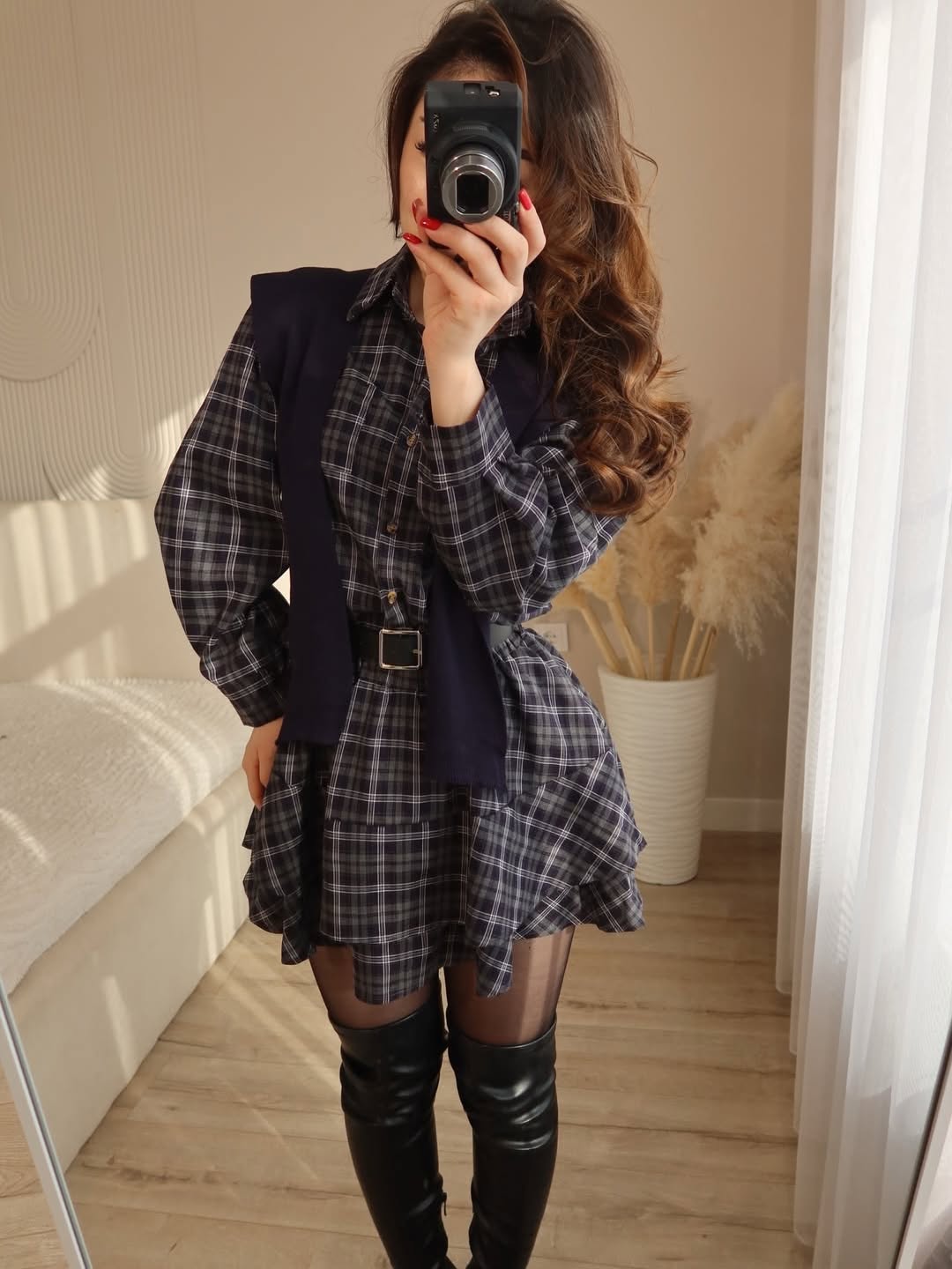 This chic plaid shirt dress layered with a structured sleeveless blazer is your perfect blend of smart + stylish. Featuring a flattering belt for a snatched waist and a playful flared hem, it gives effortless boss-lady energy with everyday comfort.