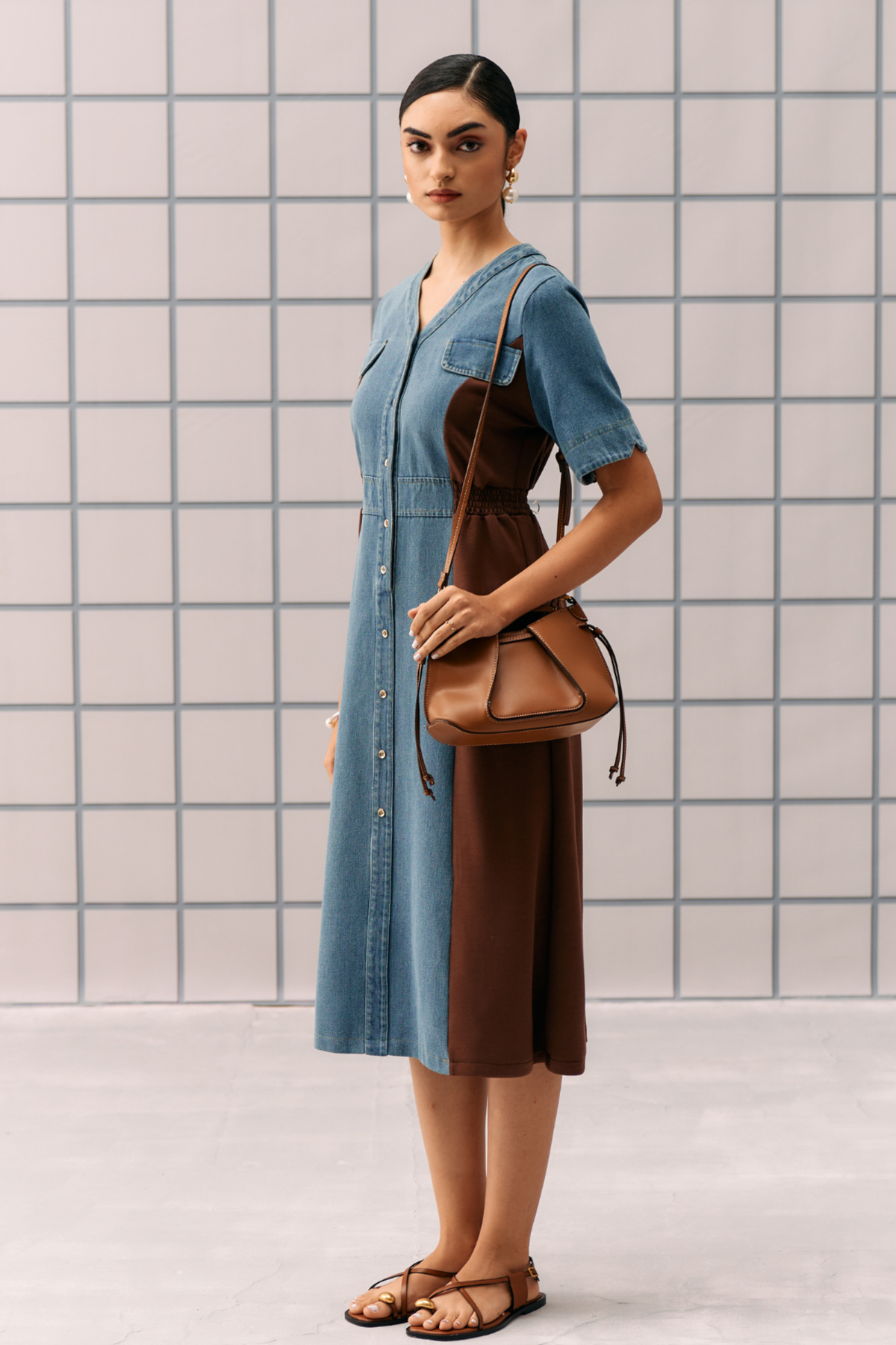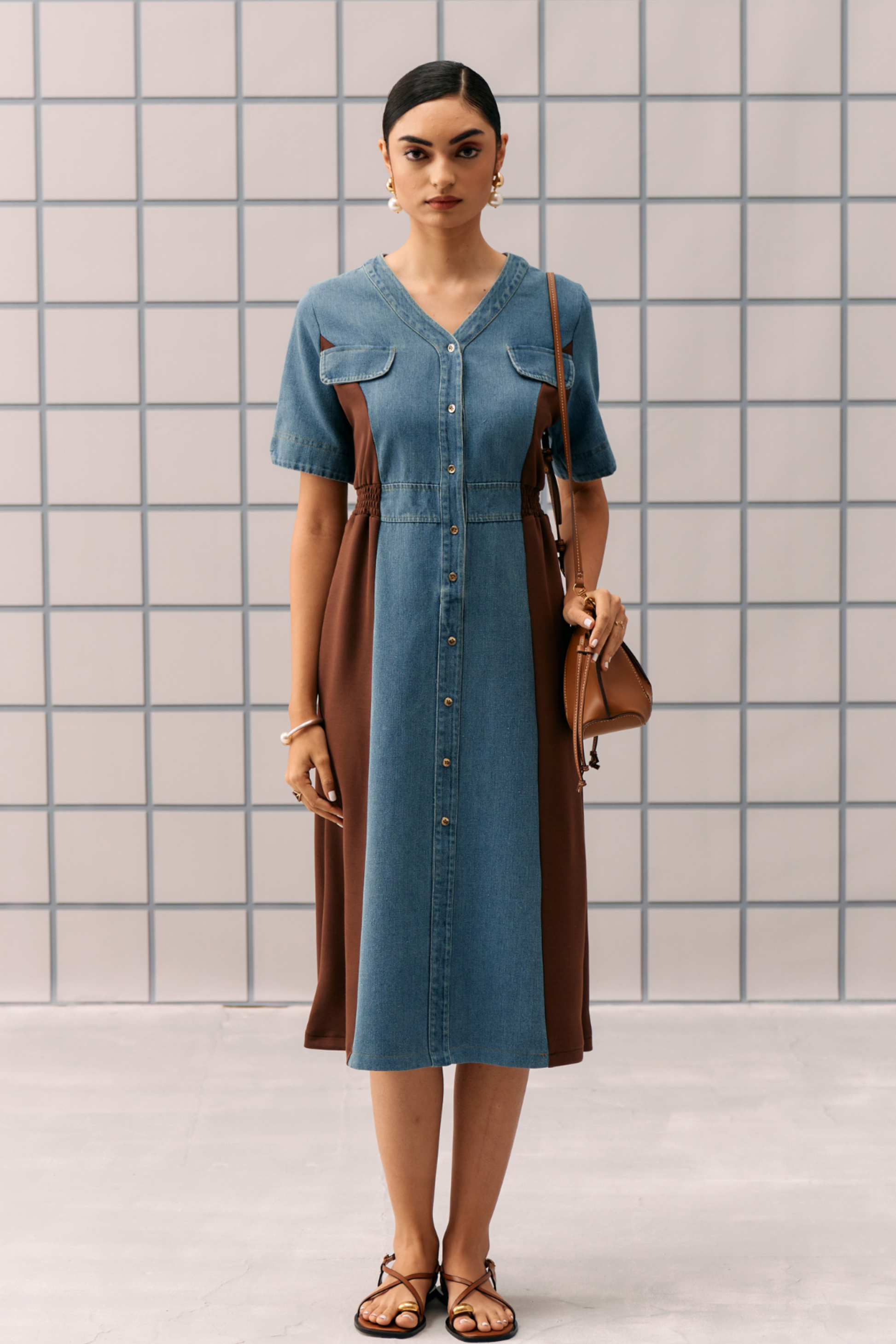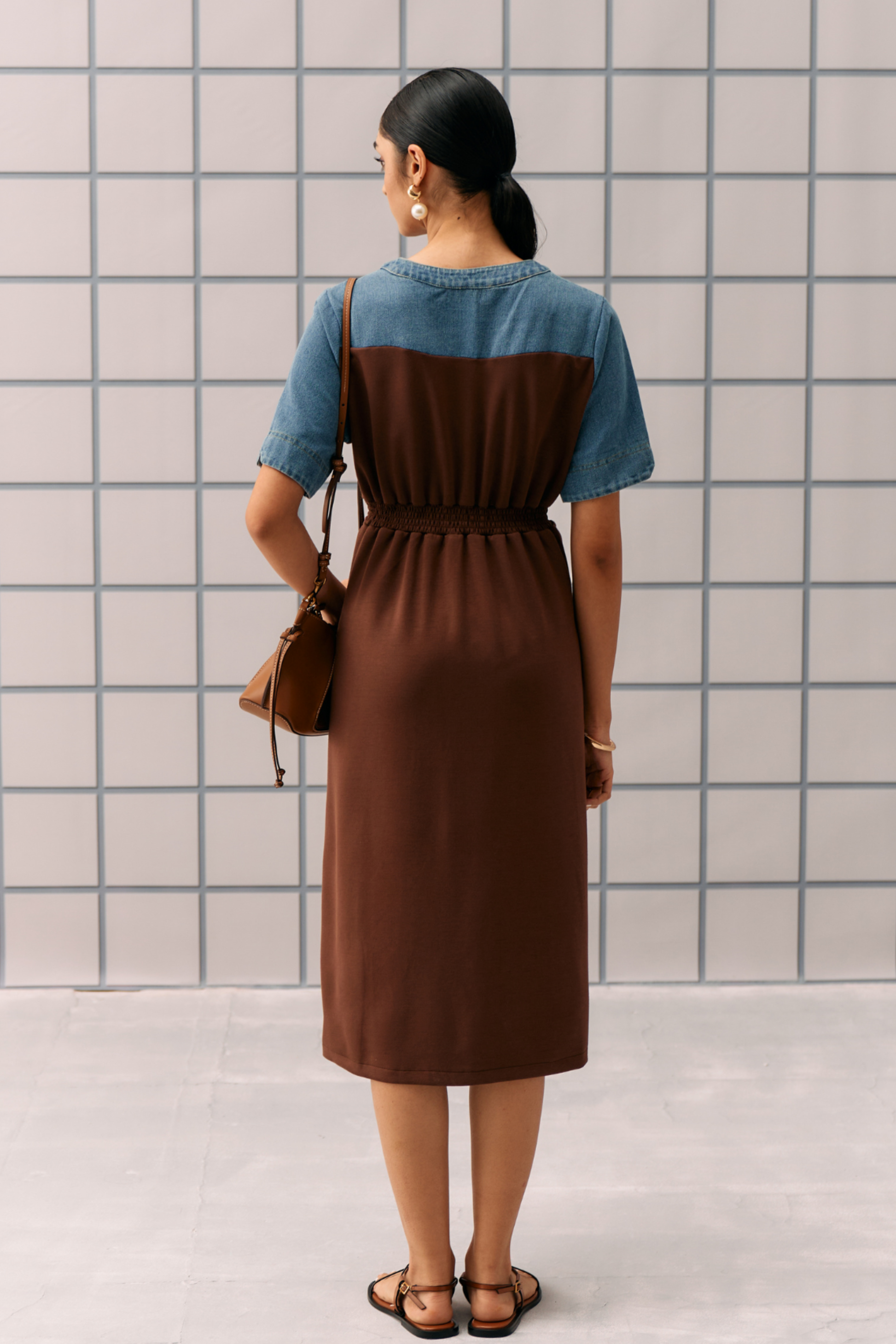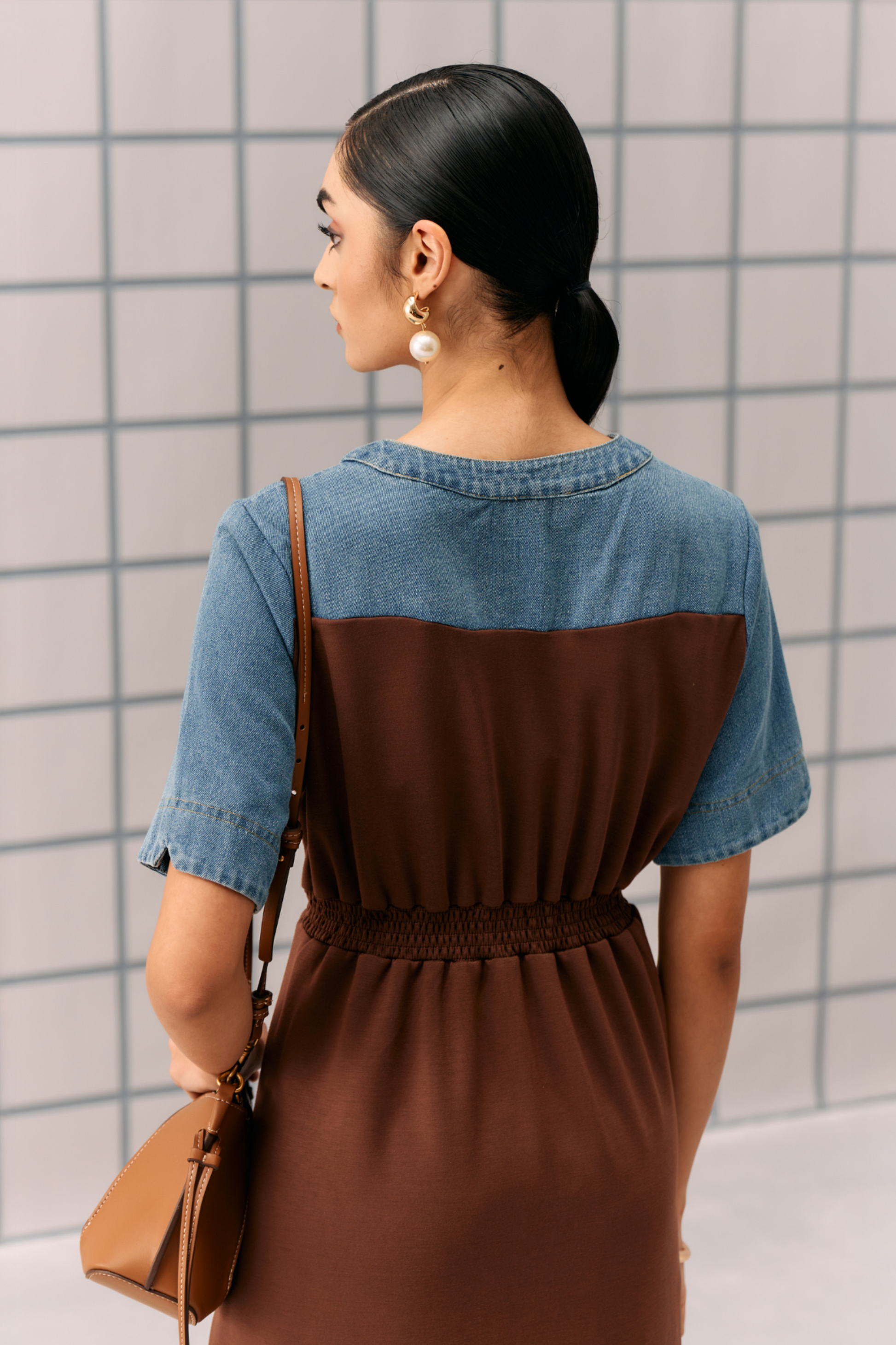 A chic button-down midi dress featuring a unique two-tone design. The front is crafted in soft denim with a collared neckline and short sleeves, while the side panels in earthy cocoa brown cotton add a flowy silhouette and contrast charm. Perfect for casual outings or brunch dates, this dress blends comfort with contemporary style.